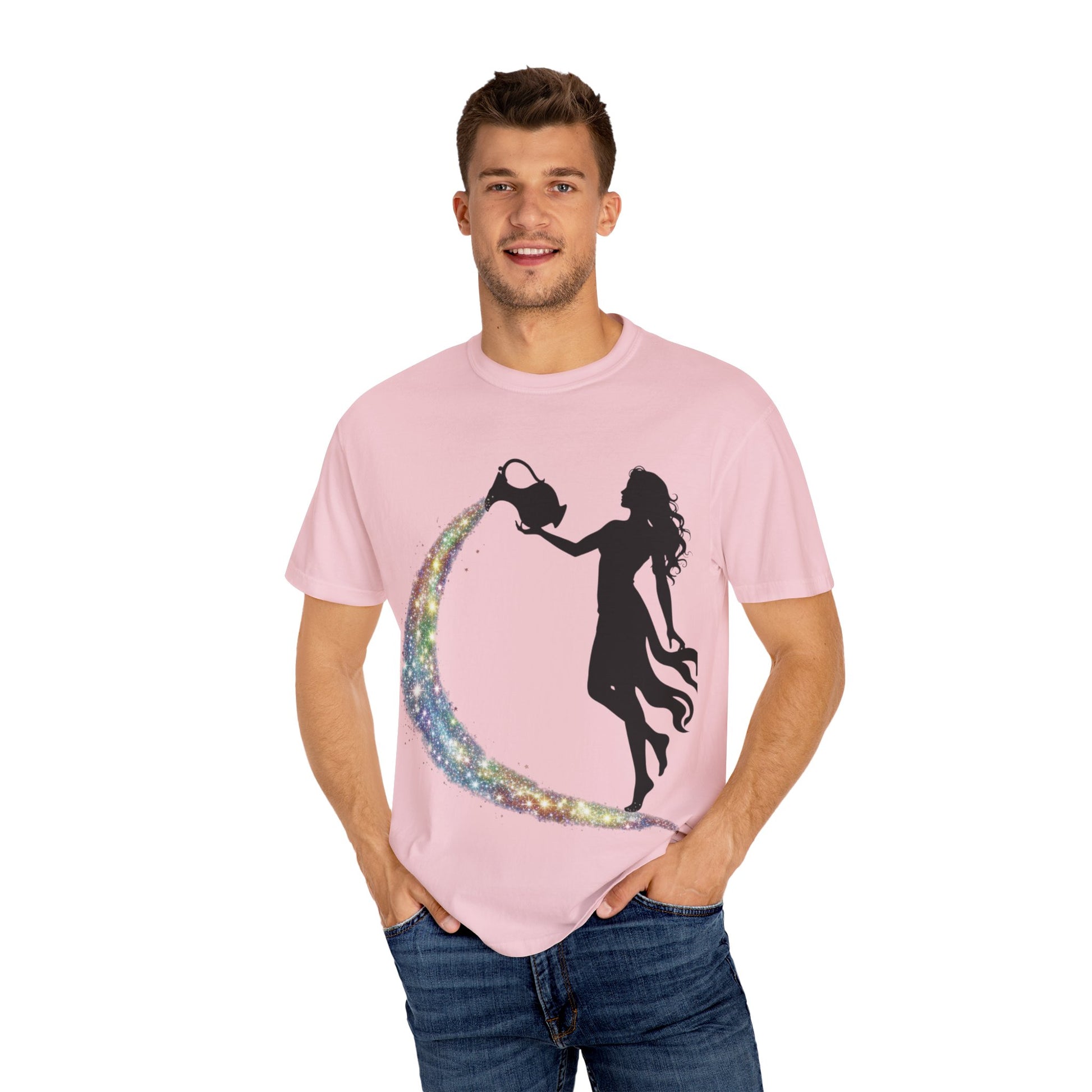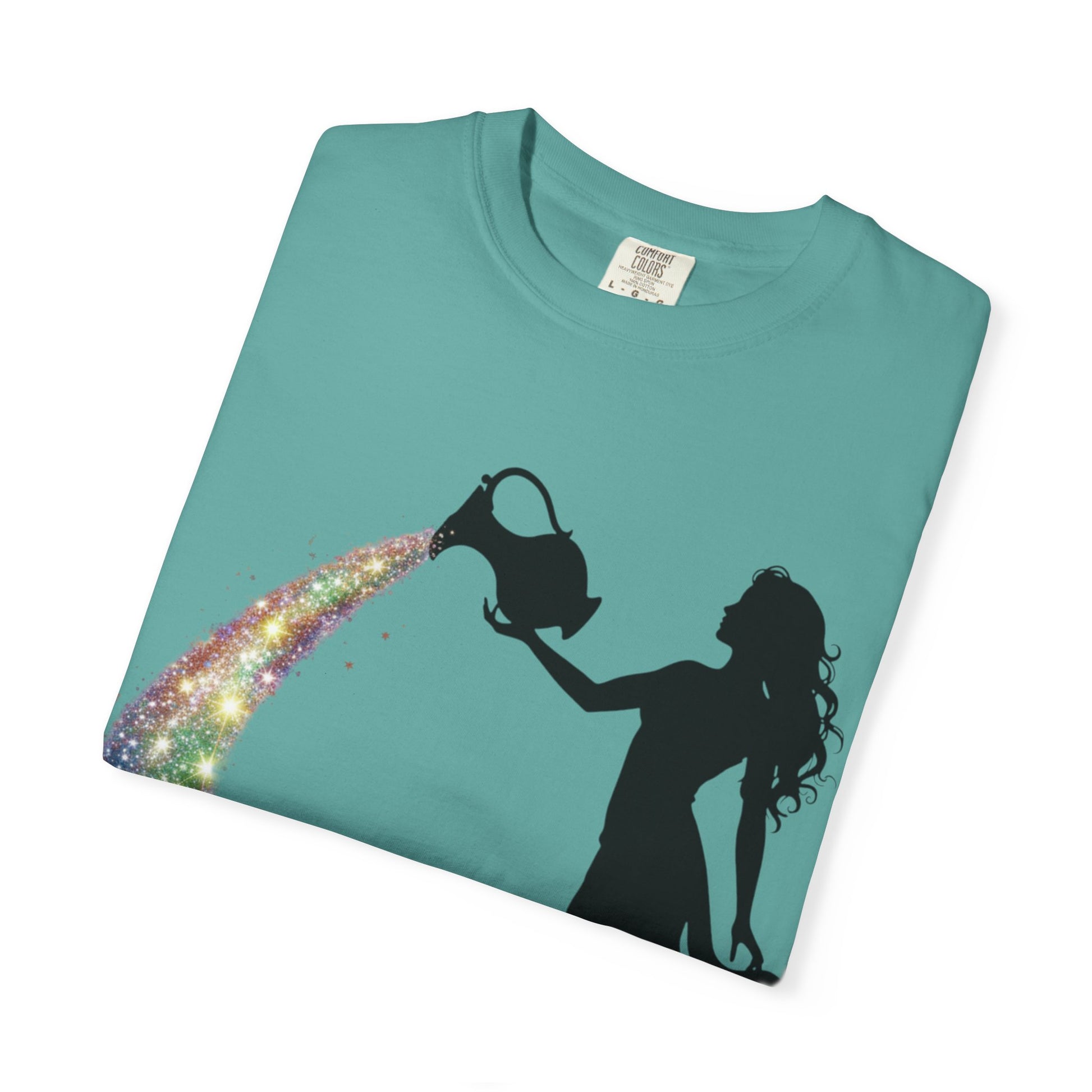 The water-bearer, a silhouette of progress, pours out a glittering galaxy of rainbow stars. This isn't just water; it's your unique spirit, your bright ideas, and your authentic self being shared freely with the world.